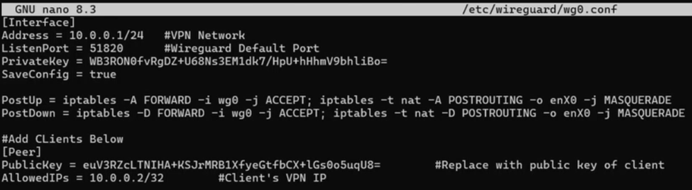 Inside this file, you will define the internal VPN network (10.0.0.1) and set up IP Masquerading (NAT). NAT is the “magic” step that allows your server to take traffic from your laptop and pass it out to the internet as if the server itself were making the request.