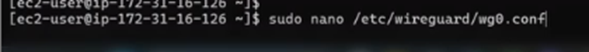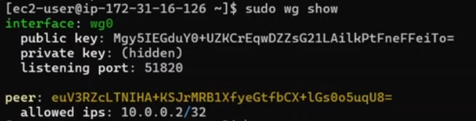 Finally, back on your AWS server, add your client’s public key to the [Peer] section of the server config and restart the interface.