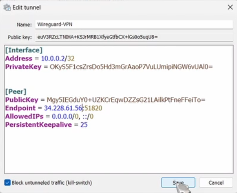 4. Set AllowedIPs to 0.0.0.0/0. This is vital—it tells your computer to send all internet traffic through the VPN, not just some of it.