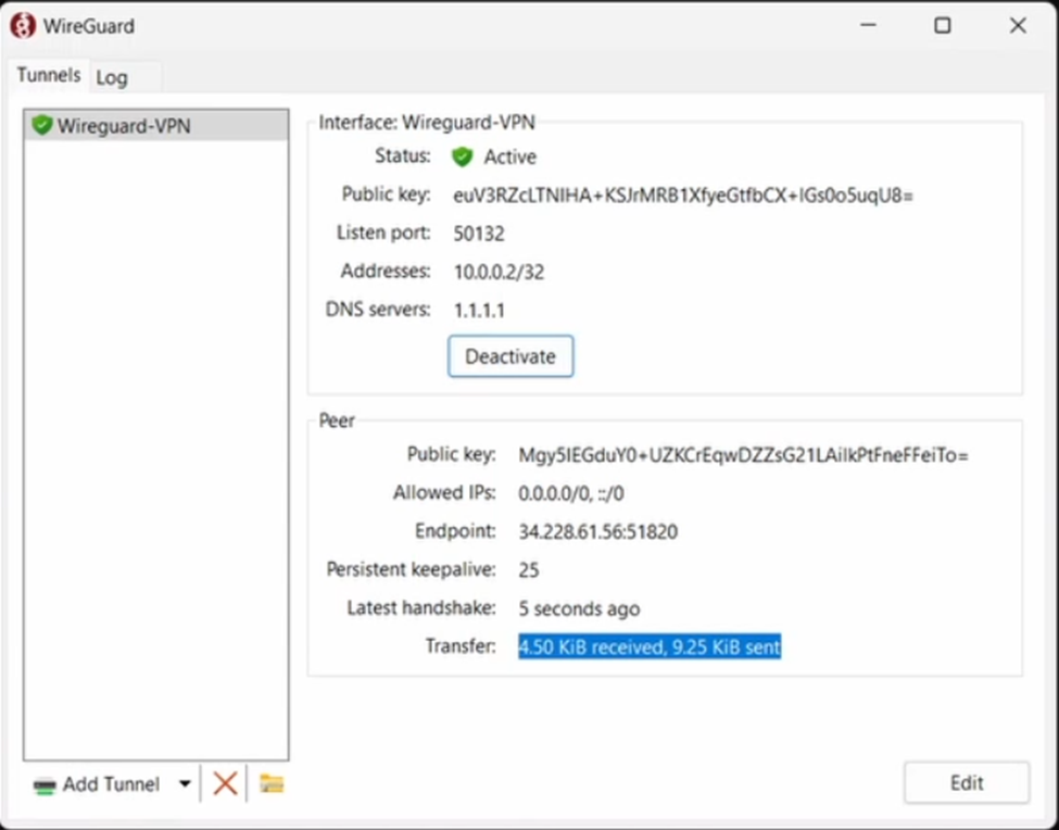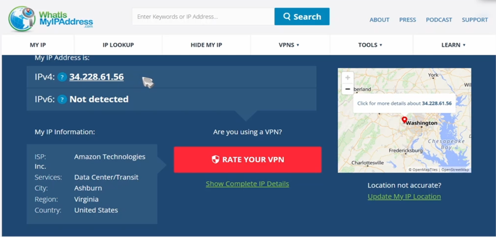Before the VPN, your IP address belongs to the local ISP. After activating the VPN, your IP should change to your AWS Elastic IP, and your location will show as the AWS data center (e.g., Virginia or Frankfurt).