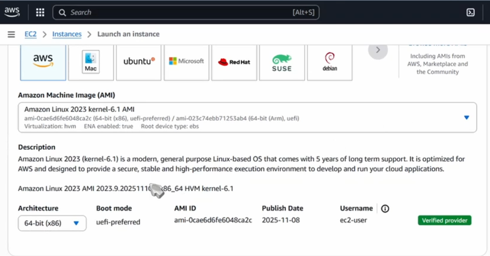 4. Select AMI: Choose Amazon Linux 2023 (Free Tier Eligible).