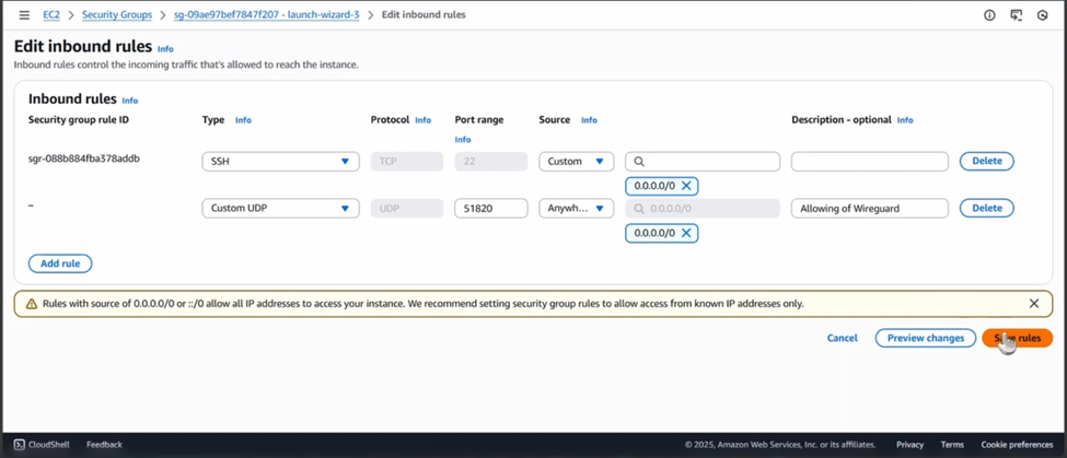• Custom UDP (Port 51820): This is the specific port WireGuard uses to listen for your connection.
