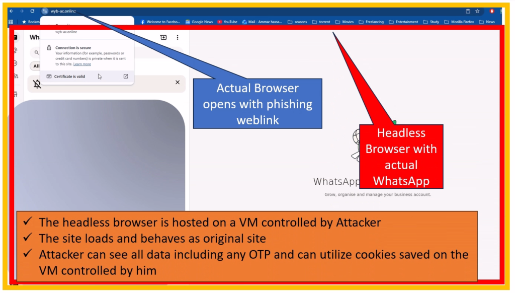 Here’s the breakdown: A victim clicks a phishing link, say from an email promising a WhatsApp update. The page loads a fake website that mimics a browser window. Inside, it either draws a spoofed login form or embeds the real WhatsApp Web page. When you enter your details or scan the QR (which sends an OTP), the attacker intercepts it in real-time. They can use tools to log keystrokes or hijack the session. This bypasses 2FA because you’re authenticating on the real site, but in their controlled browser.